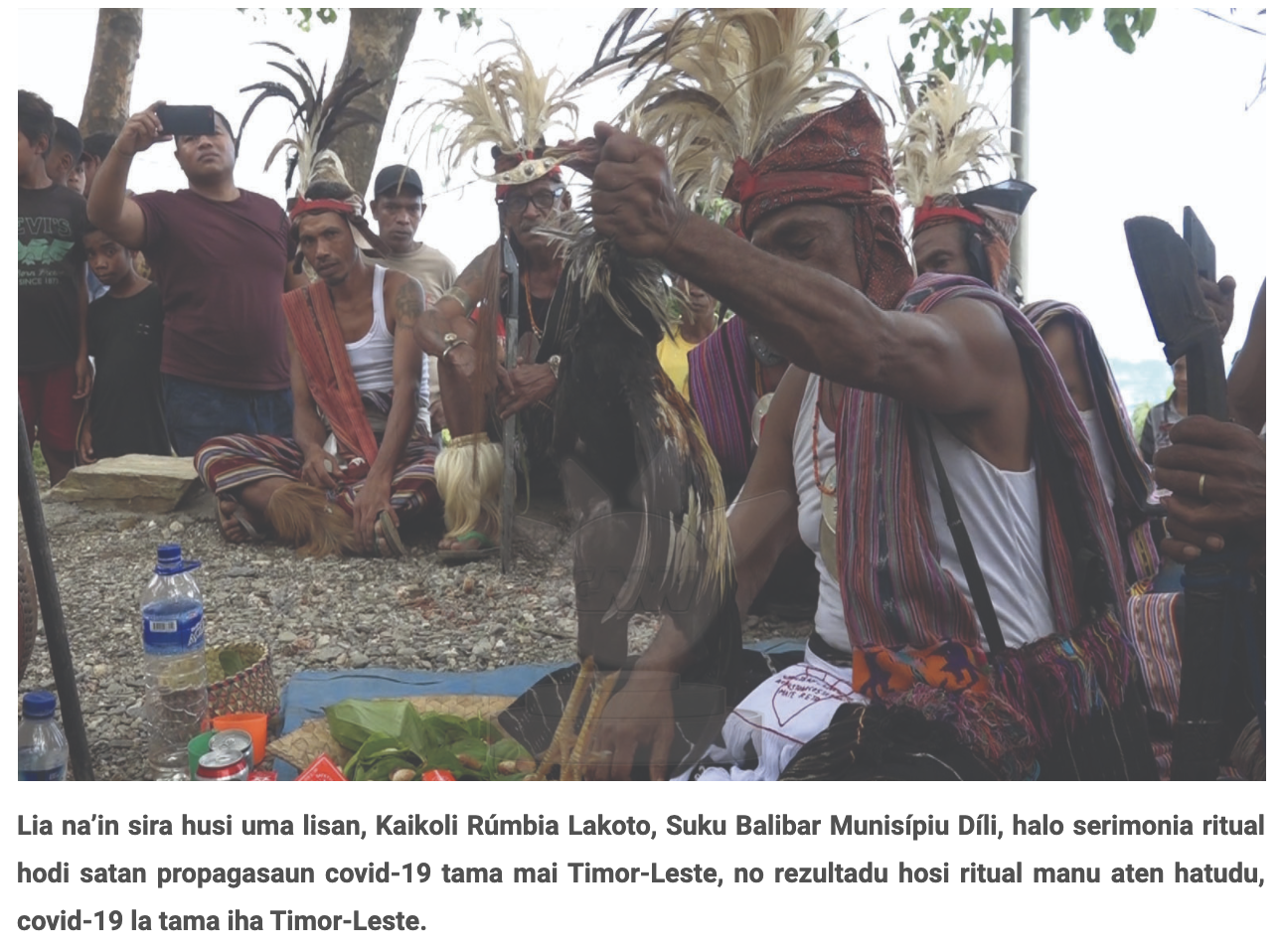 Lia-na'in sira iha Kaikoli Lakoto, suku Balibar, Munisipiu Dili halo serimónia rituál hodi satan propagasaun COVID-19 tama mai Timor-Leste. _____________ The custodians of the word of Lakoto, Balibar (Dili) conduct a ritual ceremony to ward off the spread of Covid-19 in Timor-Leste.