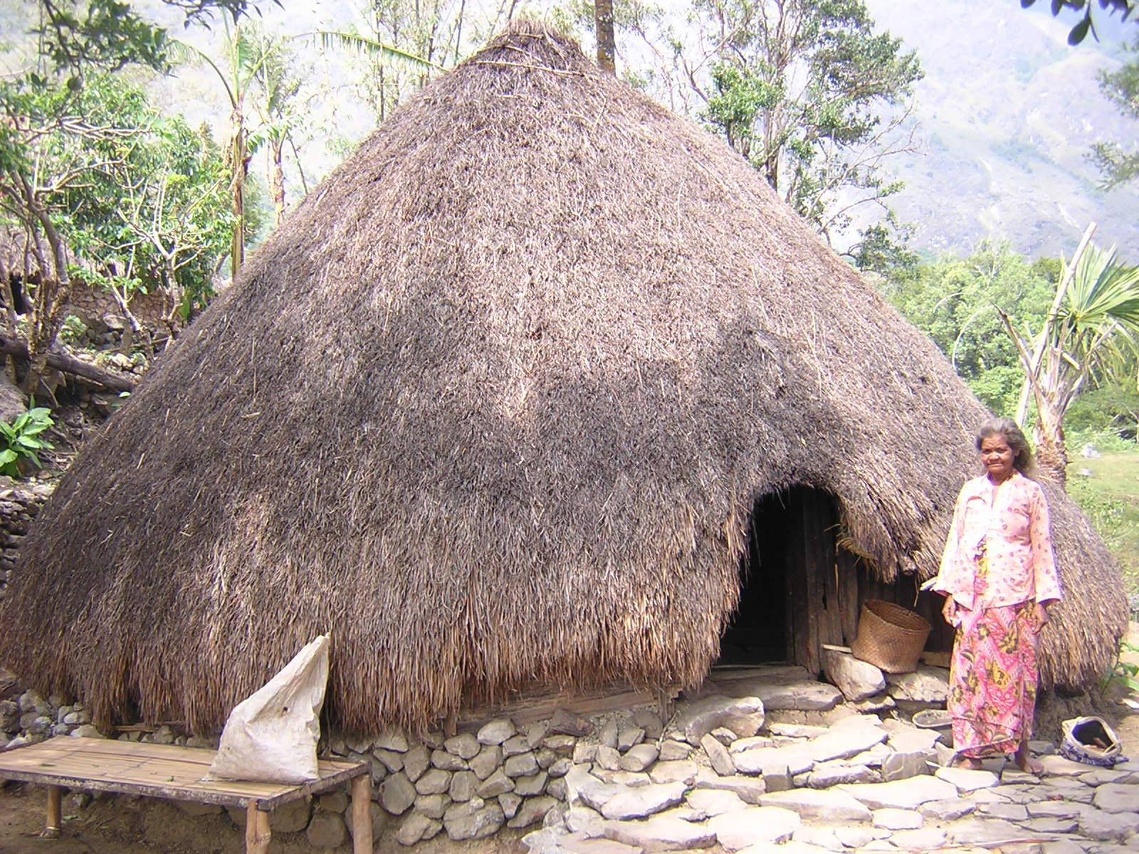 Uma Leo Malis mak uma sanak husi uma Loe Ues. Durante seremónia ka ritual sira membru husi uma Leo Malis halibur malu ho Leo Ues. Iha foto Martinha Udu Mau mak hein uma iha 2007. Leo Malis house is an offshoot of Loe Ues house. During ceremonies and rituals members of the Leo Malis house gather with those from Leo Ues. The photo shows Martinha Udu Mau in front of the house in 2007.